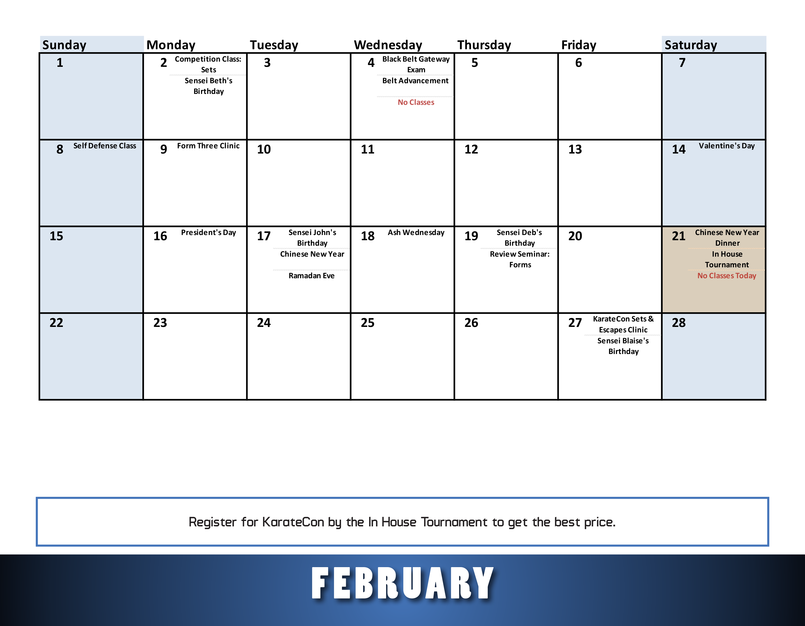 Students compete for fun and for the chance to be highlighted at KarateCon. Pizza will be served. Sign up at least one week prior to the event at www.inhousetournament.com. The In House Tournament is free if you register on time. If you register late (