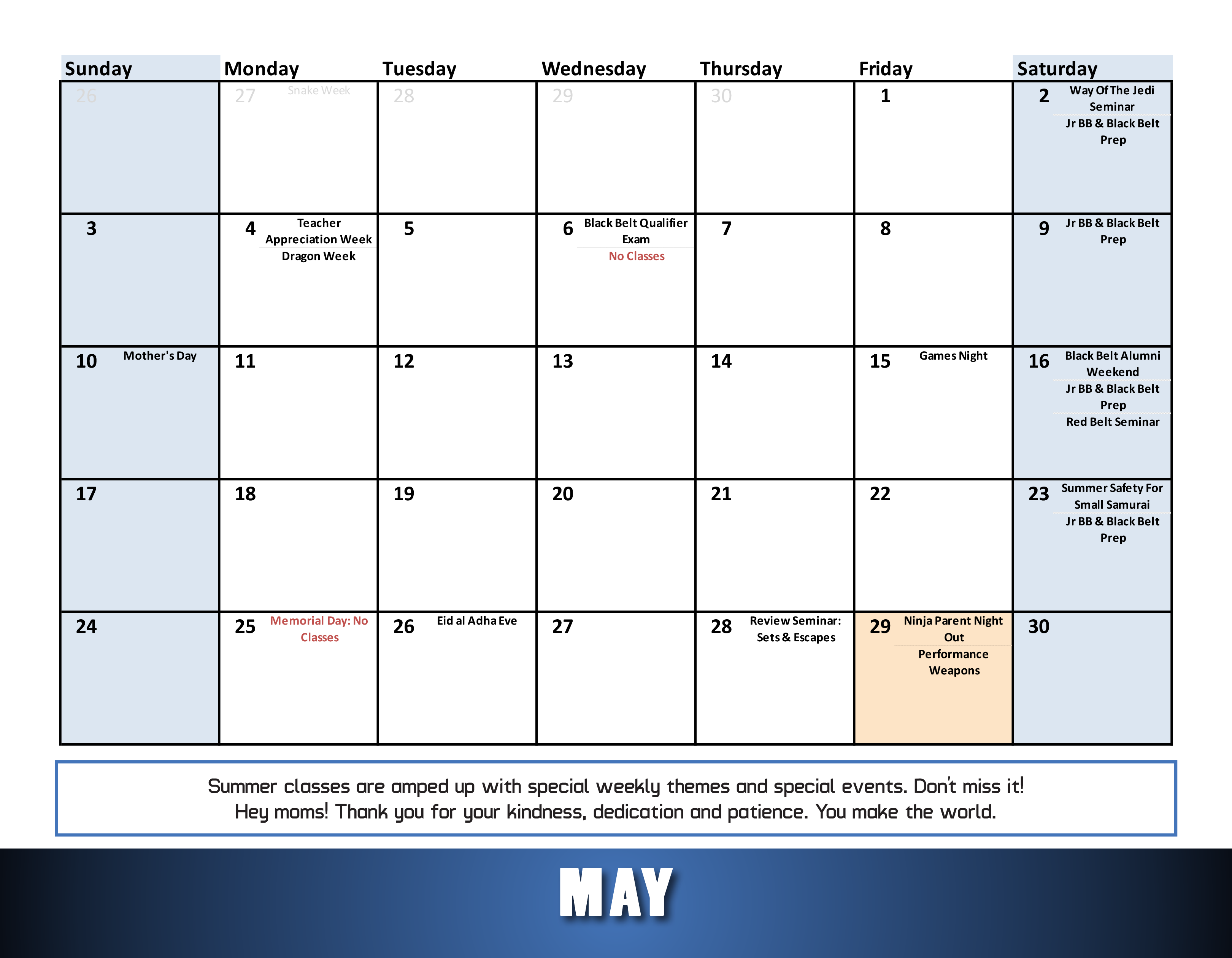 Memorial Day: No Classes: Monday May 25th
